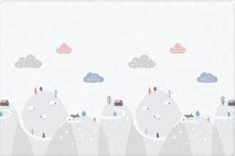 Умиротворяющая картинка с холмами, симпатичными домиками, дружелюбными овечками и редкими облаками выполнена в спокойных пастельных тонах, большую часть коврика занимает светлый фон.