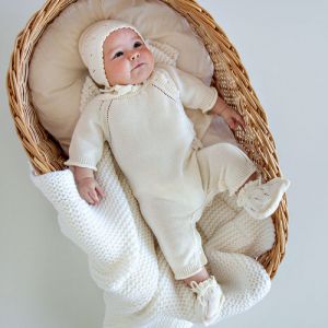 Вязаный комплект Honey с тёплым комбинезоном и шапочкой – идеальный вариант для прохладной осенней выписки малыша.