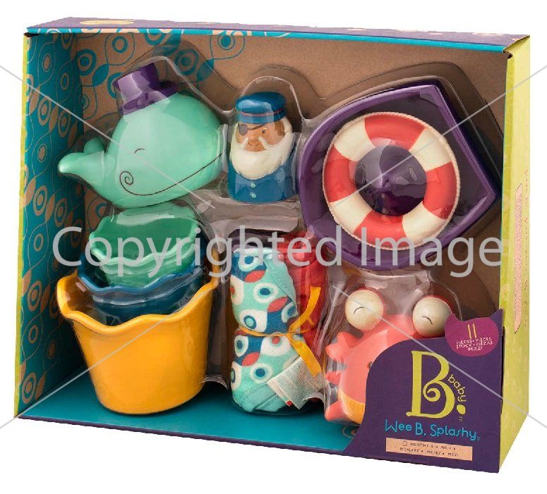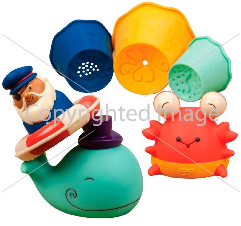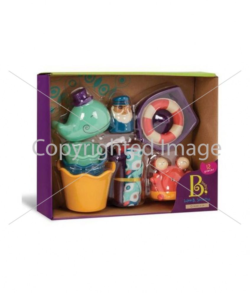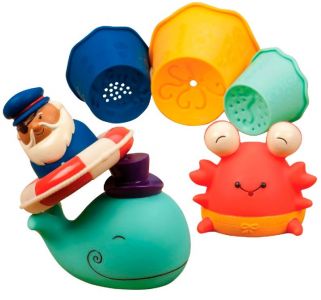 Набор включает контейнер с крышкой для хранения игрушек, мини-лодку с капитаном и спасательным кругом, 3 пластиковых формочки, 2 брызгающихся игрушки, 3 мини-полотенца.