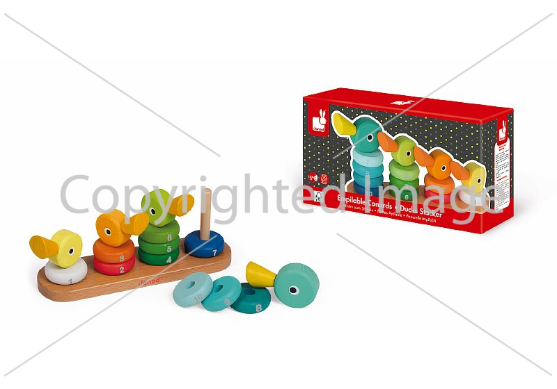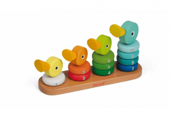Игрушка представляет собой основание с четырьмя стержнями для птичек. Каждый предназначен для определенной уточки – первая состоит из колечка и головы, вторая из двух колечек и головы, третья из трех колечек головы, а в четвертой пять элементов. Малыш учится мыслить логически, складывая колечки в правильном порядке, постепенно усваивая новый материал и пробуя загадки посложнее. Каждое кольцо подписано цифрой – эта опция поможет выучить счет орт 1 до 10.