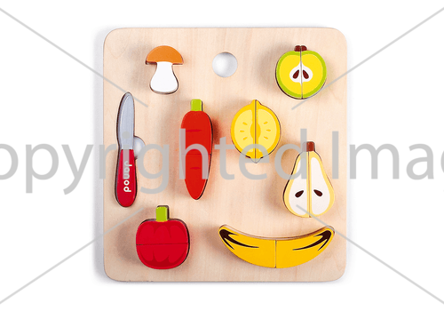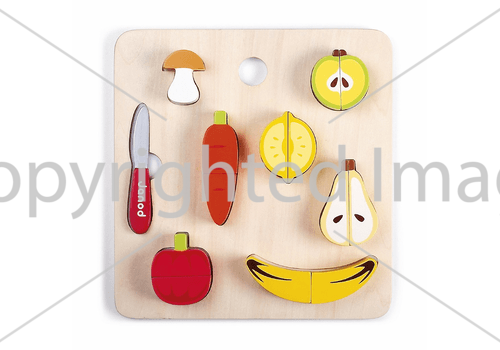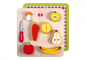 Переверните основание, и на нем можно все фрукты-овощи разделить на две части, входящим в комплект ножиком, и приготовить тем самым обед для своих кукол.