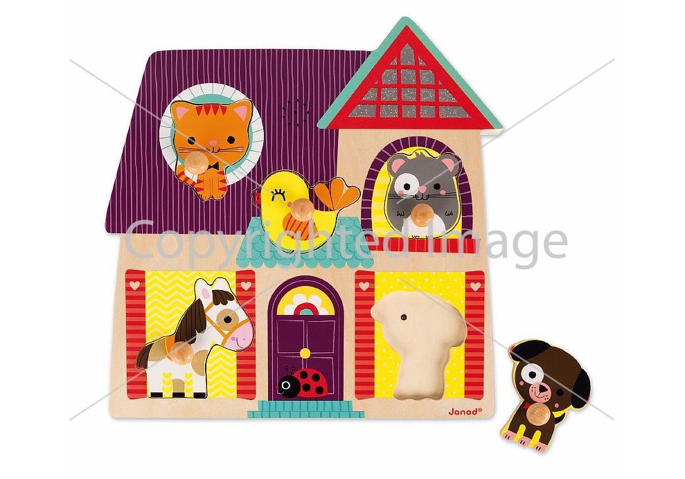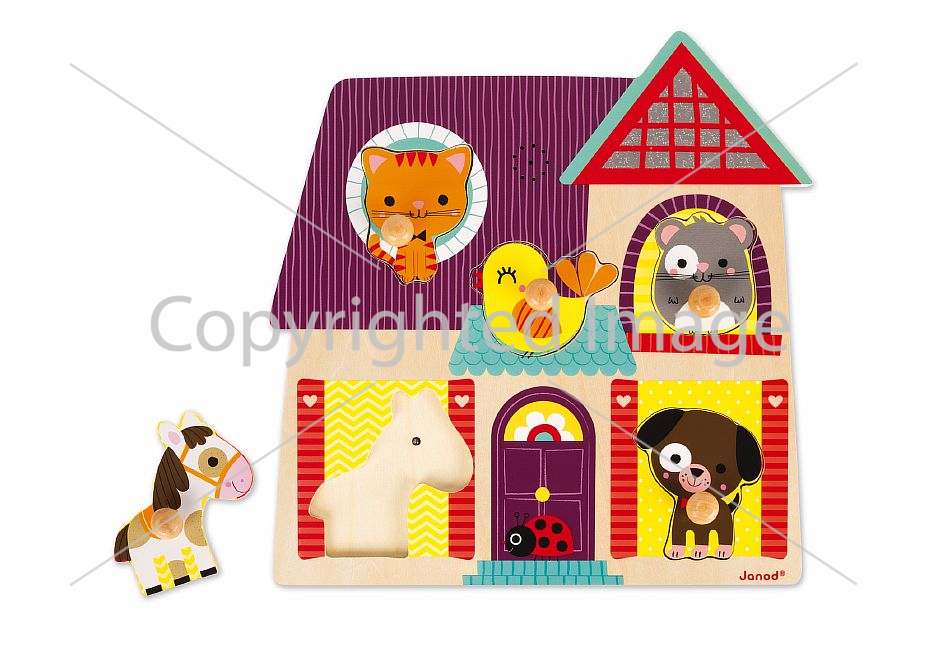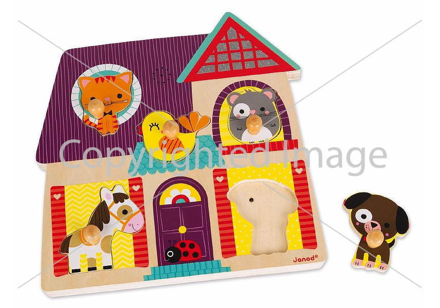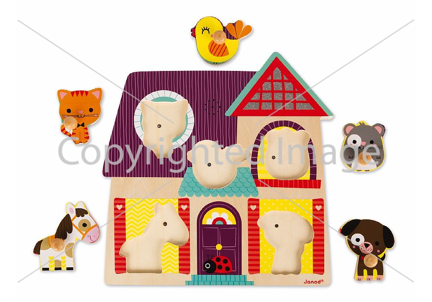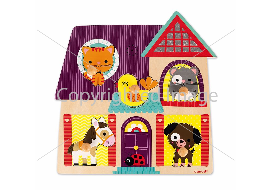 Пазл предназначен помогать малышам познавать окружающий мир. Он представляет собой яркую и красочную картинку на деревянной основе с углублениями, форма которых совпадает с фигурками зверюшек: котёнком, щенком, мышкой, лошадкой и птичкой. Пазл складывается на специальную подложку с углублениями для всех элементов, причём при правильной постановке игровых деталей начинает звучать музыка, соответствующая каждому зверьку. Все детали выполнены из натурального дерева.