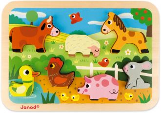 На деревянном основании пазла изображен фермерский двор с прудом, пастбище, поля. На ферме мирно уживаются такие разные животные: корова, овечка, лошадка, кролик, поросенок, курочка, уточка. Все элементы разного цвета, играя ребенок повторяет основные цвета: желтый, оранжевый, синий, голубой, зеленый, коричневый, малиновый. А еще зверей можно считать.