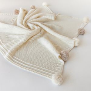 Вязаный плед Apero Pompon с помпонами поможет малышу развить мелкую моторику. Он связан из тёплой шерсти мериноса и идеально подойдёт на выписку новорожденного малыша.