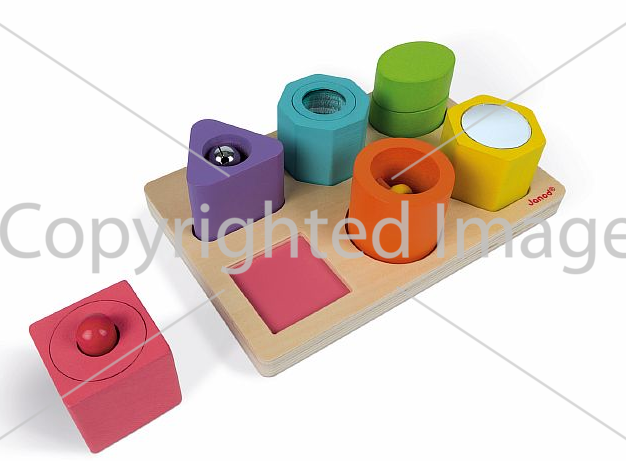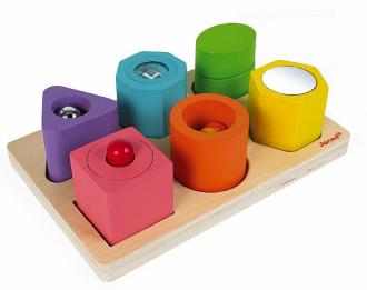 Деревянная подставка с шестью цветными выемками различной формы. В эти выемки ребенок ставит соответствующий блок. Каждый блок дополнительно обладает уникальным функционалом (безопасное зекальце, калейдоскоп, бубенчик, погремушка и другие звуковые эффекты)