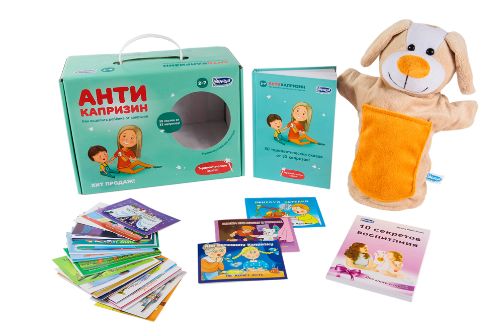 «Антикапризин» – это комплект, который, на наш взгляд, должен быть в каждой семье. Ребёнок стесняется, не хочет засыпать или плохо кушает? Не любит убирать игрушки или ходить в садик? Обижает других детей или ревнует к брату/сестре? А, может быть, к Вам подкрался кризис 3-х лет, и спокойный ранее малыш стал неуправляемым?