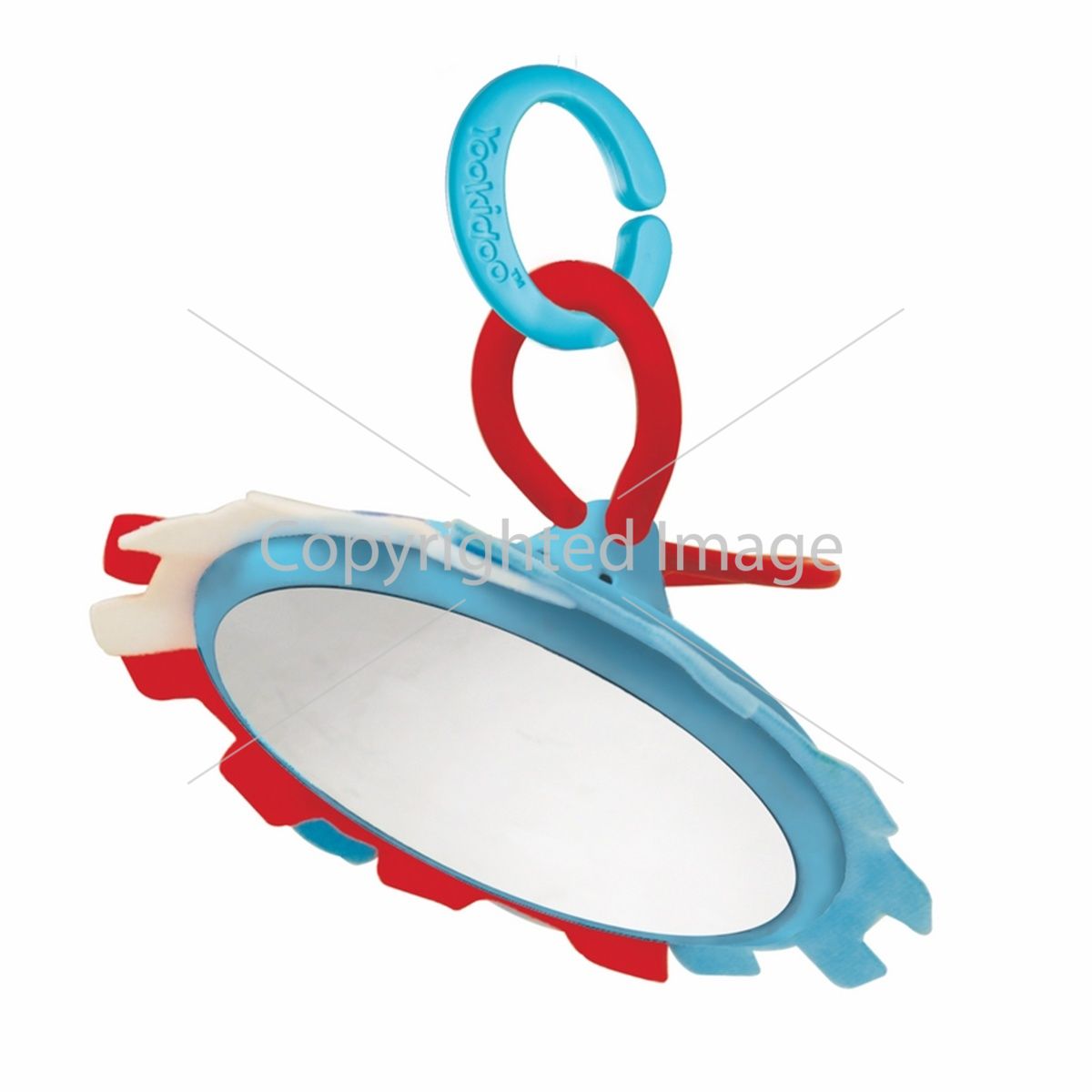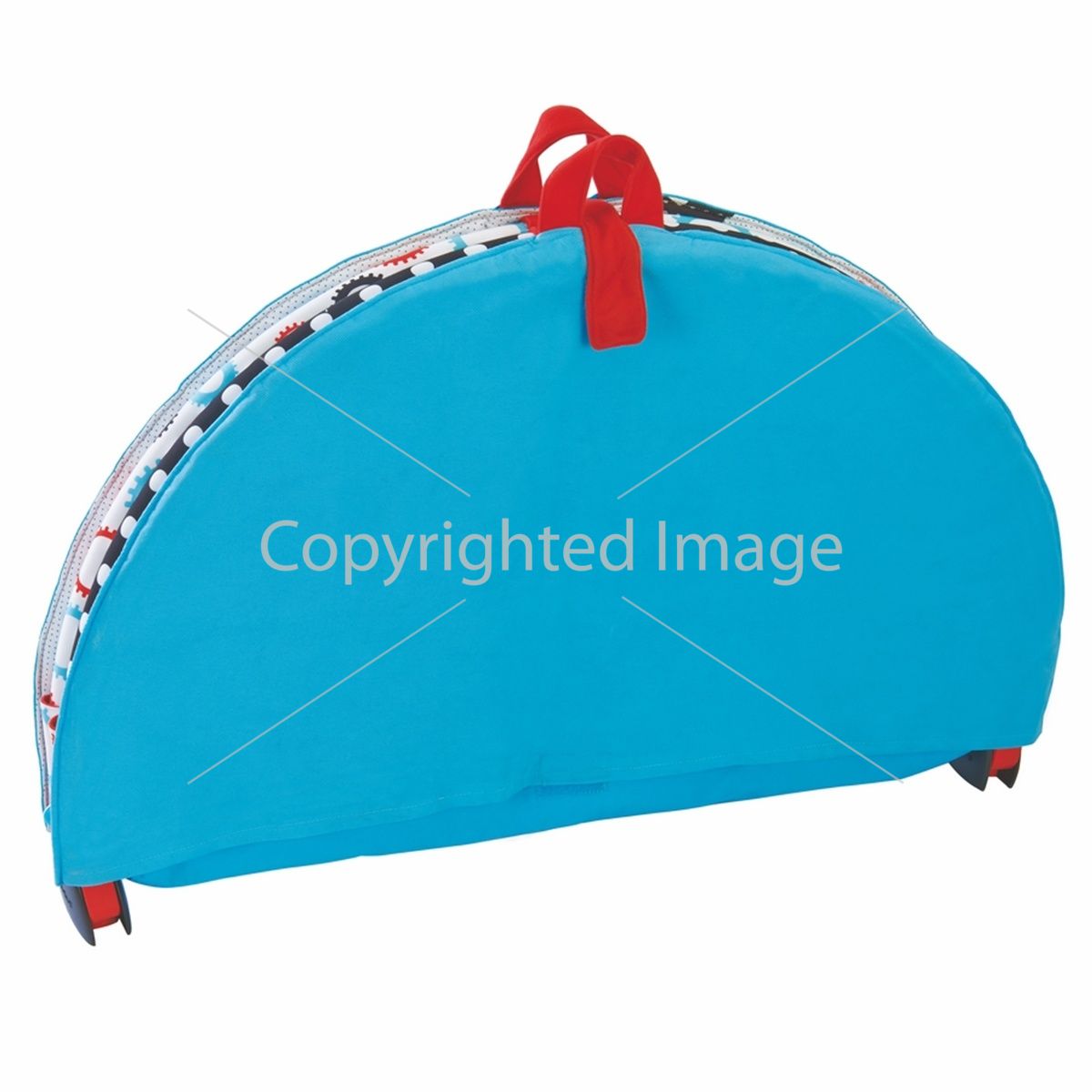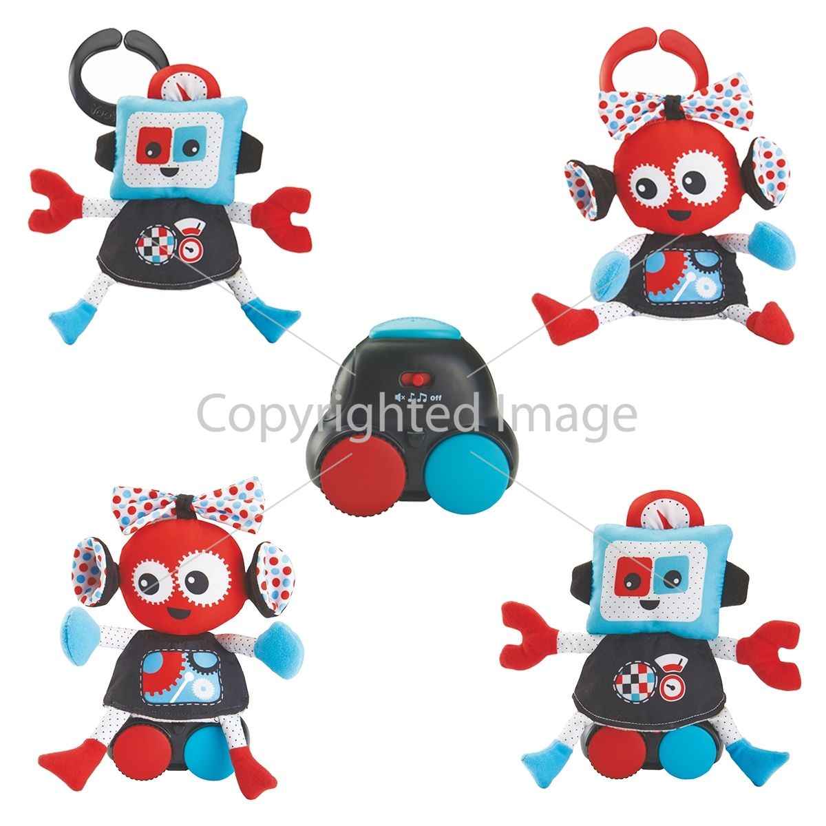Дорожка с машинкой легко закрепляется специальными ремешками как на самом коврике, так и на его дугах, что обеспечивает широкий выбор игровых позиций. Две забавные фигурки роботов могут быть закреплены сверху тележки (когда дорожка установлена на коврике) или подвешиваться снизу (в том случае, когда дорожка закреплена на дугах)